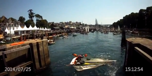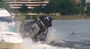 Watch as a police boat takes a turn too tight and smashes into a row of moored yachts