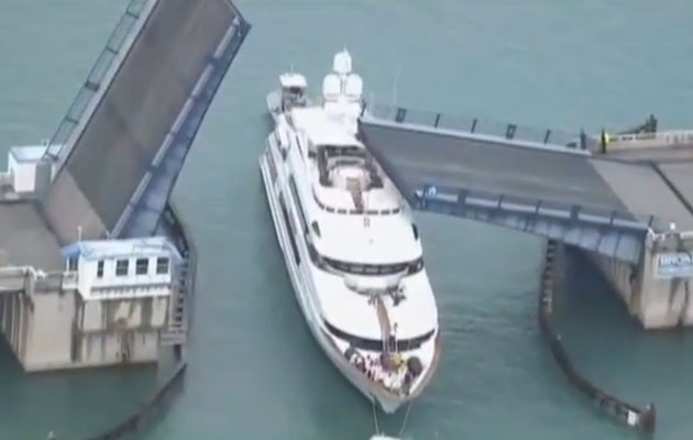 An American superyacht was damaged as a drawbridge broke and closed on top of it